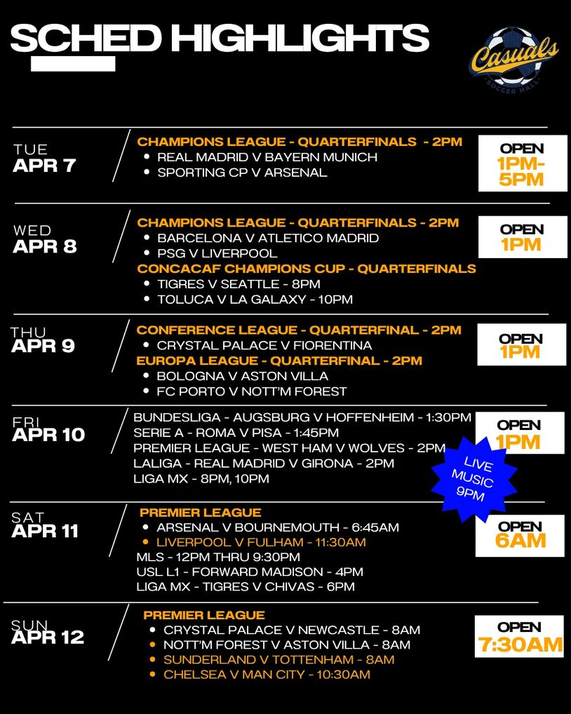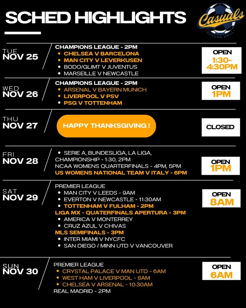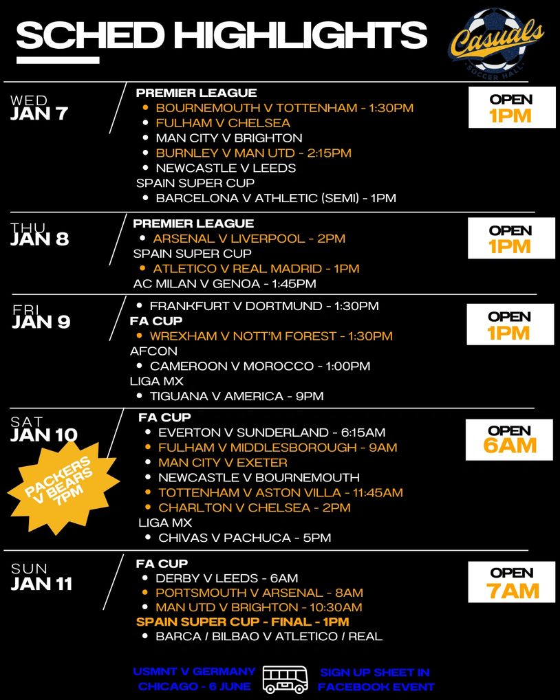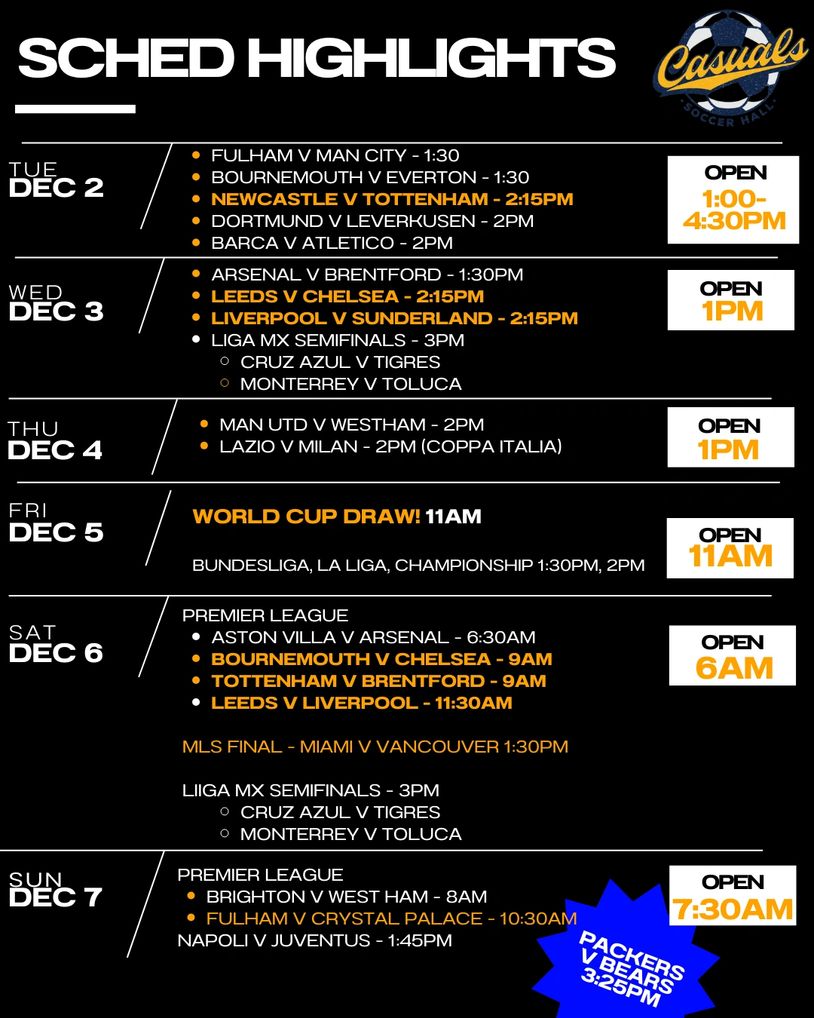 Casuals can get most matches that are broadcast on the major services to the USA... REMEMBER, we post weekly just the highlights. If you don't see your match or league, shoot us a note or come in and ask!